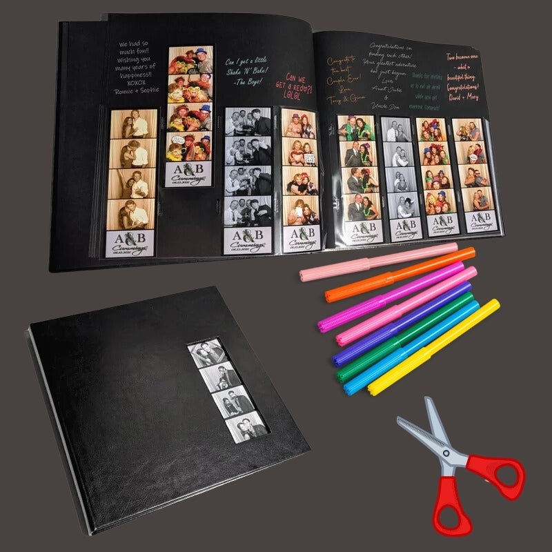 A scrapbook station provides guests with materials to create a scrapbook during the event. They can add their photo booth prints, write messages, and decorate the pages.